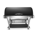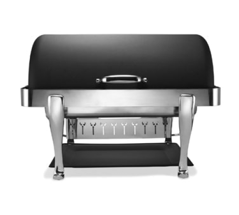 Elite Chafer, rectangular, 2 gallon, stainless steel with chrome Roman legs, handles & medallions, dripless water pan & cover, windguard, full roll down & halfway locking cover, slow down lock mechanism, black Nero finish, Limited Lifetime Warranty