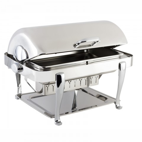 Elite Chafer, rectangular, 2 gallon, stainless steel with gold-plated Roman legs, handles & medallions, dripless water pan & cover, windguard, full roll down & halfway locking cover, slow down lock mechanism, Limited Lifetime Warranty