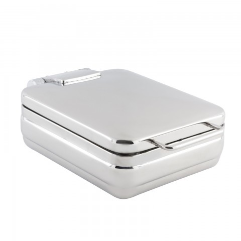 Induction Chafer, 12-1/4" L x 19" W x 5-1/2" H, rectangular, 1 gallon, half size, solid hinged cover, without stand, includes food pan, 18/8 stainless steel