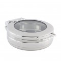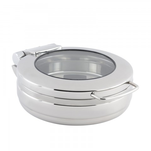 Induction Chafer, 14-3/4" L x 19" W x 5-1/8" H, round, 1 gallon, small round chafer, glass hinged cover, without stand, includes food pan, 18/8 stainless steel