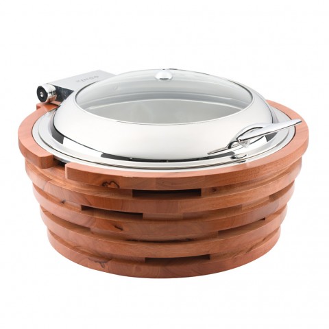 Sequoia Chafer, round, 8 qt., 21-2/8" x 18-1/2" x 14-9/16", glass lid, wooden stand, with heating plate, 500 watts, 120v/60/1-ph, 4.71 amps