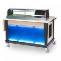Sushi Cart, 54-1/2"L x 30"W x 45"H, solid surface counter top with solid surface drop leaf, 48" curved glass refrigerated sushi display case, back-lit front textured blue acrylic panel, 4" heavy duty non-marking casters, (2) locking, (2) non-locking, 120v/60/1-ph, 13 amps, NEMA L5-20P