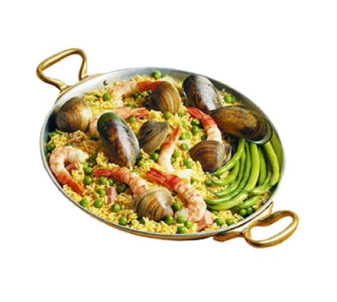 Paella Dish, 2 qt. 20 oz., 12" x 15-1/2" x 2" H, round, with brass handles, aluminum with Pewter-Glo finish