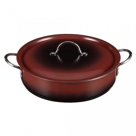 Country French X - Ombre Brazier Pot, 6 qt, 12 3/8" dia x 3", Round, With Lid, (2) 2" Round Riveted Handles, Oven & Dishwasher Safe, Induction Ready, 5 Ply, Stainless Steel, Merlot
