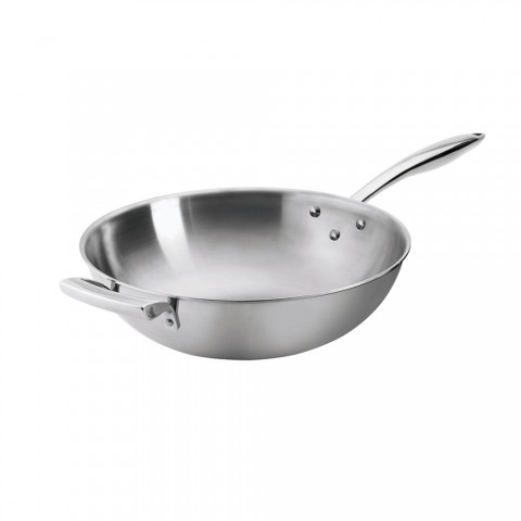 Thermalloy® Wok, 9 qt., 14" dia. x 3-1/2"H, without cover, handle with off-set rivets, operates with gas/electric/ceramic/halogen/induction, tri-ply stainless steel with aluminum core, natural finish, NSF (cash & carry packaging)