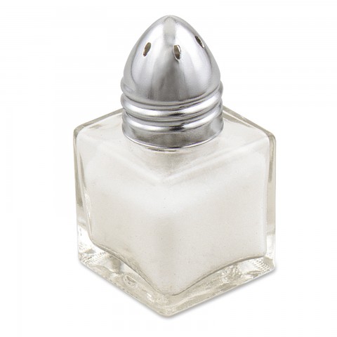 Salt & Pepper Shaker, 1/2 oz., 1-1/2" x 2"H, mini, universal holes, square, clear glass jar with chrome-plated top (must be purchased in quantities of 36 dozen)