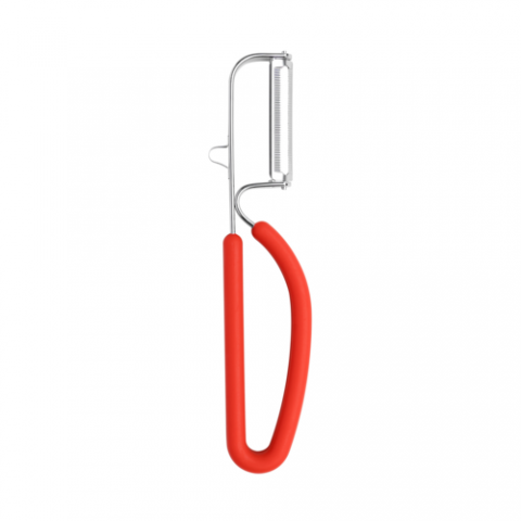 Peeler, dual serrated blade with blade protector, integrated side cutter, soft TPE coated handle, Japanese stainless steel blade