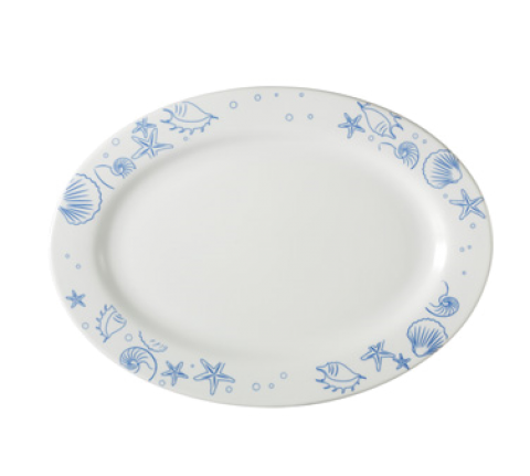 Atlantic Seashell Platter, 18"L x 12-1/2"W x 1-3/4"H, oval, dishwasher, oven, and microwave safe, porcelain, Blue decorated Rim/Super White (Sold by case)