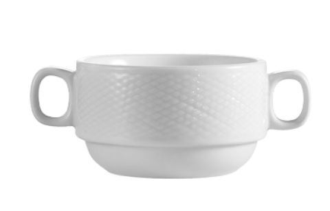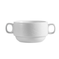 Boston Bouillon Cup, 8 oz., 5-3/4"L x 3-7/8"W x 2-1/4"H, round, stackable, with handles, embossed, dishwasher, oven and microwave safe, porcelain, Super White (Sold by case)