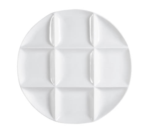 CMP Compartment Tray, 12" dia. x 1"H, round, 9-compartments, dishwasher, oven and microwave safe, porcelain, Super White (Sold by case)