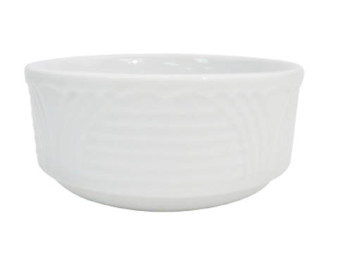Corona Bouillon Cup, 7-1/2 oz., 4-3/8" dia. x 2"H, round, stackable, embossed, dishwasher, oven and microwave safe, porcelain, Super White (Sold by case)