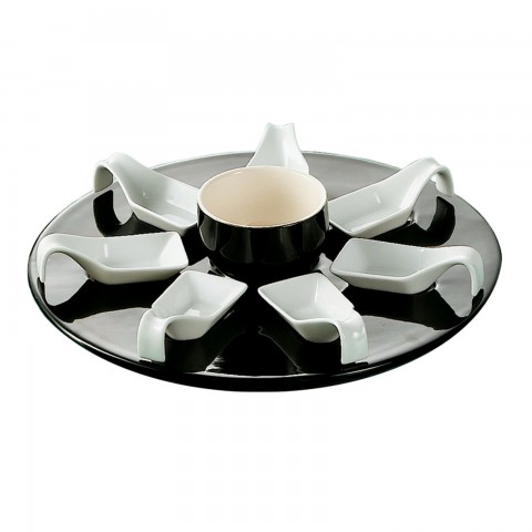 Party Collection Tasting Spoon Set, includes: (7) 1/2 oz., 3-3/4"L x 1-7/8"W x 1-1/2"H, square spoons, (1) 7 oz., 3-1/2" dia. x 2"H, round bowl and (1) 12-3/4" dia. x 1/2"H, round tray, dishwasher, oven and microwave safe, porcelain, Black/Super White (Sold by case)
