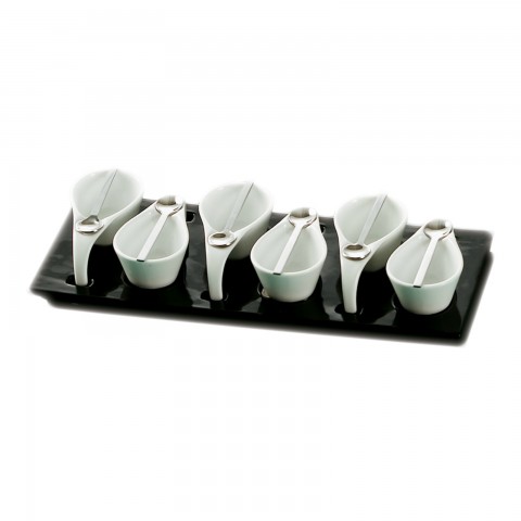 Party Collection Tasting Cup Set, includes: (6) 2 oz., 4-1/2"L x 2-1/2"W x 1-3/4"H, oval cups, with handles, (6) metal spoons and (1) 14-1/2"L x 5-3/4"W x 1/2"H, rectangular tray, dishwasher, oven and microwave safe, porcelain, Black/Super White (Sold by case)