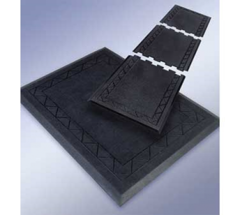 Comfort Zone Anti-Fatigue Mat, one end, 2'-4" x 3', 1/2" thick, interlocking, molded rubber with pebbled surface, insulated honeycomb backing, bevel safety edge on three sides, grease & slip resistant, for check stands, work stations, assembly lines, behind counters, & industrial areas, black