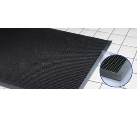 Finger Top Flexible Scraper Mat, 24" x 32", 5/8" thick, molded rubber with built-in moisture dam, bevel safety edge all sides, anti-fatigue, for use in entrances, work stations, restrooms, & behind counters, for indoor & outdoor use, black