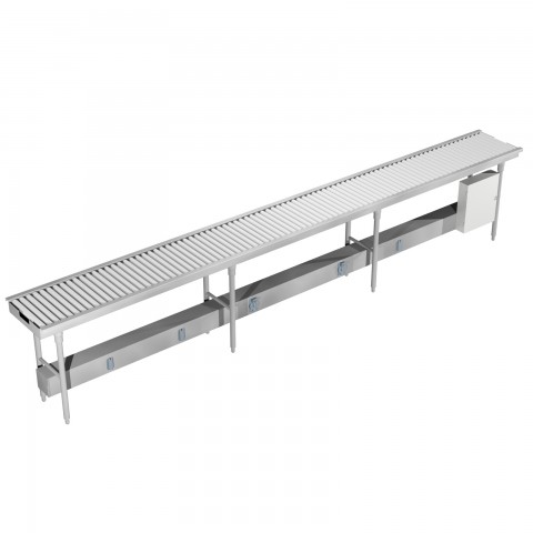 Tray Make-Up Conveyor, custom length per spec, non-powered roller conveyor, 1-1/4" plastic rollers with stainless steel balls in nylon bearings on 3" centers accommodates trays up to 16" wide (provide tray size), raised curbing, solid pan, tubular stainless steel legs with adjustable bullet feet, stainless steel construction ETLus, NSF (contact factory for price)