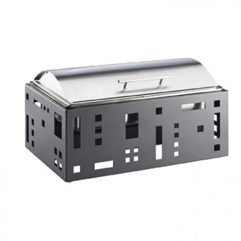 Squared Chafer, 8 qt. capacity, 23"W x 15"D x 16"H, rectangular, removable stainless steel hinged top cover with handle, pan, accommodates 4-5 cans of fuel, windguard, decorative geometric cutouts, black metal