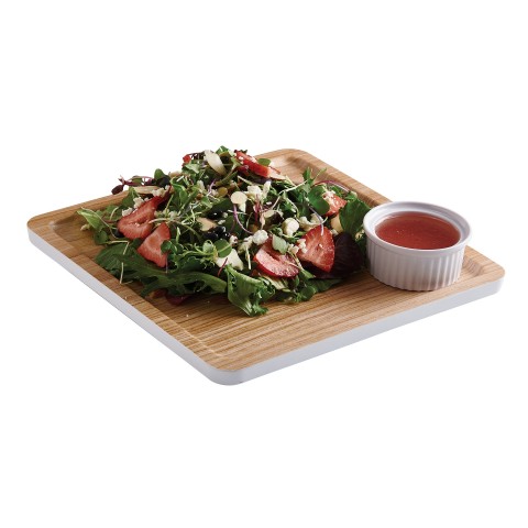 Serving Tray, 9"W x 9"D x 1/2"H, stackable, white melamine, natural wood