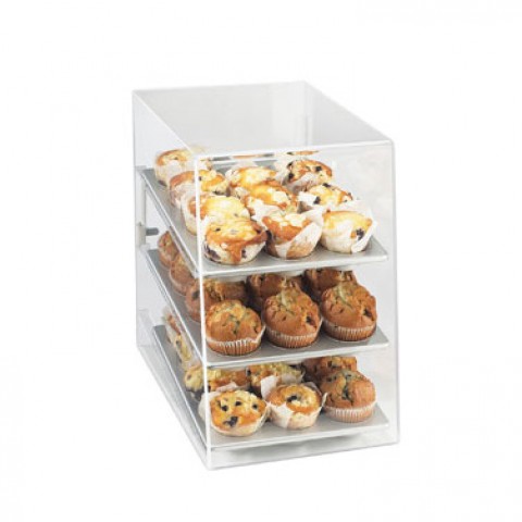 Classic Display Case, 11-1/2"W x 17"D x 17"H, 3-tier, attendant serve, non-refrigerated, countertop, slant front, rear door, see-thru design, (3) 10" x 14" (335-10) trays, clear acrylic, BPA Free (UPS Oversize 1)