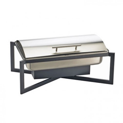 One by One Chafer, 8 qt. capacity, 24-1/4"W x 15-1/4"D x 8-1/2"H, rectangular, hinged stainless steel lift-off lid with handle, canned heat, stainless steel cover, black metal frame