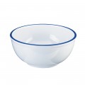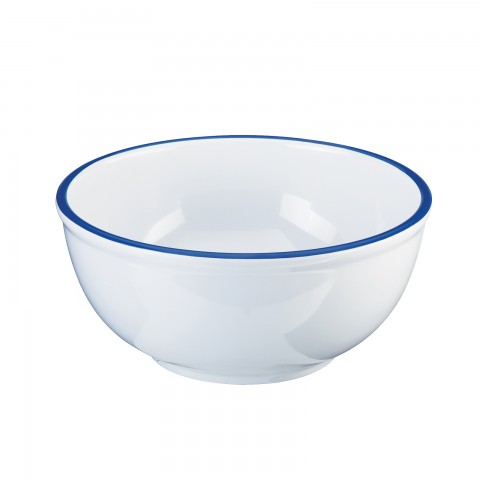 Enamelware Bowl, 10-3/4" dia. x 5"H, round, blue rim, dishwasher safe, melamine, white