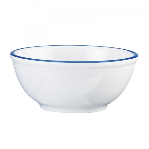 Enamelware Bowl, 8-1/4" dia. x 3-3/4"H, round, blue rim, dishwasher safe, melamine, white