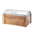 Madera Chafer, 8 qt. capacity, 22"W x 14-1/4"D x 9"H, rectangular, hinged stainless steel lift-off lid with handle, easy access door for chafer fuel, rustic pine base