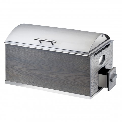 Ashwood Chafer, 8 qt. capacity, 22"W x 14"D x 13-1/2"H, rectangular, hinged stainless steel lift-off lid with handle, geometric end cutouts, windguard, chafer fuel drawer, oak wood, gray wash