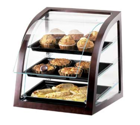 Westport Display Case, 17"W x 17"D x 18"H, 3-tier, self serve, non-refrigerated, countertop, Euro sloped front, single top hinged front door with knob, (3) 10" x 14" (335-10-13) black trays, acrylic body, dark wood frame, BPA Free