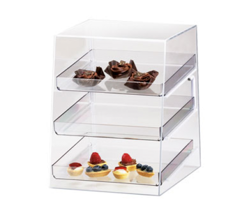 Classic Display Case, 10"W x 15"D x 13-1/2"H, 3-tier, attendant serve, non-refrigerated, countertop, slant front, rear door, see-thru design, (3) removable 280 T-trays, clear acrylic, BPA Free