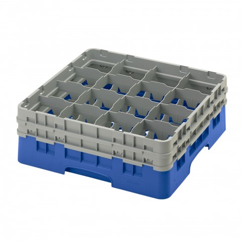 Camrack® Glass Rack, with (2) soft gray extenders, full size, 19-3/4" x 19-3/4" x 7-1/4", (16) compartments, 4-3/8" max. dia., 6-1/8" max. height, blue, HACCP compliant, NSF