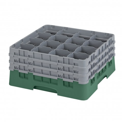 Camrack® Glass Rack, with (3) soft gray extenders, full size, 19-3/4" x 19-3/4" x 8-7/8", (16) compartments, 4-3/8" max. dia., 7-3/4" max. height, Sherwood green, HACCP compliant, NSF