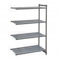 Camshelving® Basics Plus Add-On Unit, 18"W x 60"L x 84"H, 4-tier, withstands temperature from -36°F (-38°C) to 190°F (88°C), includes: (4) vented polypropylene shelf plates with Camguard® antimicrobial protection, (2) composite posts with leveling feet installed, pre-assembled post connectors & wedges, (8) traverses & (4) bags of 8 dovetails (4 each A & B), 600 lbs. capacity per shelf (400 lbs. top shelf) /1,800 lbs. max capacity, brushed graphite, NSF