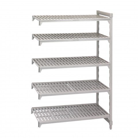 Camshelving® Premium Add-On Unit, 24"W x 60"L x 84"H, 5-tier, withstands temperature from -36°F (-38°C) to 190°F (88°C), includes: (5) vented polypropylene shelf plates with Camguard® antimicrobial protection, (1) unassembled post kit (posts constructed of steel with polypropylene exterior), (10) traverses & molded-in dovetails, 800 lbs. capacity per shelf /2,000 lbs. max capacity, speckled gray, NSF