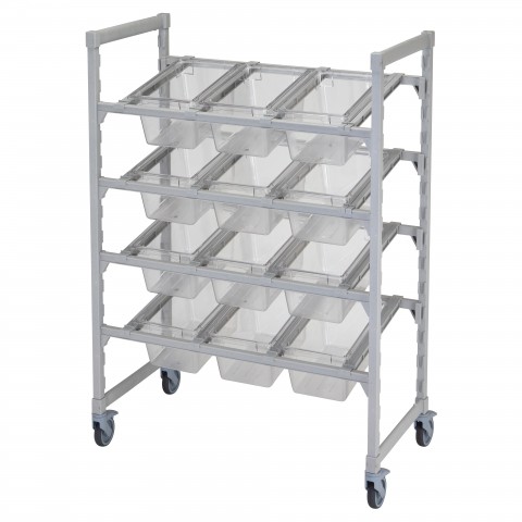 Camshelving® Premium Mobile Flex Station Unit, 24"W x 48"L x 67"H, 4-tiers: (4) open shelves with divider bars for holding food pans, includes; (2) pre-assembled 24" x 67" mobile post kits (posts constructed of steel with polypropylene exterior), (8) 48" traverses, (36) angled divider bars, (12) identification tags, and (4) swivel total locking casters, speckled gray, 900 lbs. max capacity