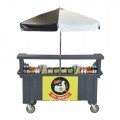 Camcruiser® Vending Cart, 74-1/2" x 31-3/4" x 94"H, (3) full size counter top wells, (3) rear compartments (2 holding, 1 open), includes (1) white polyethylene cutting board, 72" dia. umbrella, accommodates cash box and tray, removable menu board, (4) 8" swivel casters with brakes, polyethylene, granite gray with black & white umbrella