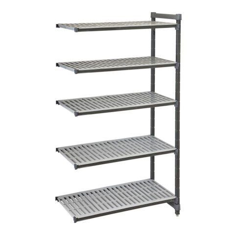 Camshelving® Elements XTRA Stationary Add-On Unit, 18"W x 24"L x 84"H, 5-tier, withstands temperature from -36°F (-38°C) to 190°F (88°C), includes: (5) vented reinforced polypropylene shelf plates with Camguard® antimicrobial protection, (2) composite posts with leveling feet installed, pre-assembled post connectors & wedges, (10) Universal Traverses &(5) bags of 4 dovetails (10 left, 10 right), 800 lbs. capacity per shelf /2,400 lbs. max capacity, speckled gray, NSF (NOTE: This is a new product line. It is NOT compatible with original Elements Series products.)
