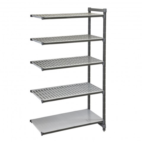 Camshelving® Elements XTRA Stationary Add-On Unit, 21"W x 54"L x 84"H, 5-tier, withstands temperature from -36°F (-38°C) to 190°F (88°C), includes: (4) vented and (1) solid reinforced polypropylene shelf plates with Camguard® antimicrobial protection, (2) composite posts with leveling feet installed, pre-assembled post connectors & wedges, (10) Universal Traverses &(5) bags of 4 dovetails (10 left, 10 right), 800 lbs. capacity per shelf /2,400 lbs. max capacity, speckled gray, NSF (NOTE: This is a new product line. It is NOT compatible with original Elements Series products.)