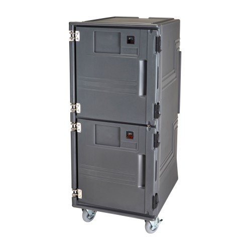 Security Package Pro Cart Ultra™ Hot Food Pan Carrier, electric, front loading, holds (16) 18" x 26" sheet pans, (32) 13" x 18" 1/2 size sheet pans, (32) GN 1/1 food pans (2-1/2" deep) (2-1/2" deep), (16) 15-3/4" x 23-1/2" trays, and (16) 16" x 16" x 2" pizza boxes, (2) gasket free magnetic quick-close doors (non-removable), 4" nylon latches, menu pocket not included, 5 pairs of stainless steel Universal rails/compartment with 3" - 1-1/2" spacing, solar digital thermometer, molded-in handles, perimeter bumper, 9' cord with plug, (4) 6" x 2" heavy duty tamper resistant casters (2 fixed, 2 swivel with brakes), polyethylene exterior, charcoal gray, 110v/50/60/1-ph, 529 watts, 4.6 amps, NEMA 5-15P, cETLus