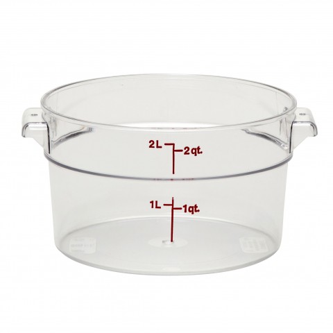 Camwear® Storage Container, round, 2 qt., 8-3/16" dia. x 4-3/16"H, withstands temperature of -40° F to 210° F, stain resistant, molded-in handle, durable polycarbonate construction, (covers sold separately), clear, NSF