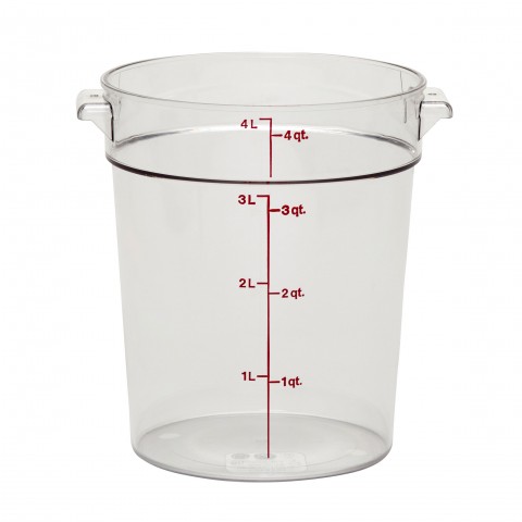 Camwear® Storage Container, round, 4 qt., 8-3/16" dia. x 8-9/16"H, withstands temperature of -40° F to 210° F, stain resistant, molded-in handle, durable polycarbonate construction, (covers sold separately), clear, NSF