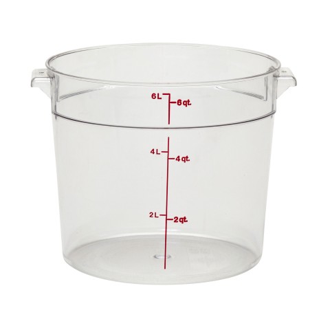 Camwear® Storage Container, round, 6 qt., 9-15/16" dia. x 7-15/16"H, withstands temperature of -40° F to 210° F, stain resistant, molded-in handle, durable polycarbonate construction, (covers sold separately), clear, NSF