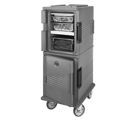 Ultra Camcart® Heated Food Pan Carrier, 20-1⁄2"W x 27-1⁄8"D x 54"H, heated top door only, front loading, one-piece double wall polyethylene shell, polyurethane foam insulated, holds (12) 2-1/2" deep food pans, (8) 4" deep food pans, (6) 6" deep food pans, (4) 8" deep food pans, molded-in handles, nylon latch, vent cap, (4) 6" casters (2 swivel, 2 fixed, 1 with brake), 110v/50/60/1-ph, 230 watts, 2.0 amps, NEMA 5-15P, slate blue, NSF, ENERGY STAR®, cETLus, CE