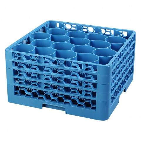 OptiClean™ NeWave™ Dishwasher Glass Rack, 20-rounded compartments with (4) Sure-Lock extenders, full-size, holds glasses up to 3-9/16" in diameter with inside height of 10-1/4", double-wall construction, quick draining, positive stacking, four-way tracking, comfort curve handles on all 4 sides, polypropylene, textured finish, blue, NSF, BPA Free, Made in USA