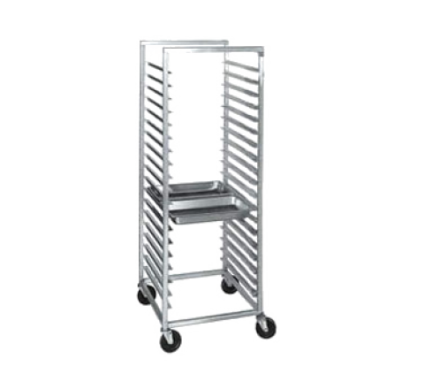 Steam Table Pan Rack, 12 X 20 Steam Table Pan Rack, Standard Series, 24.5"W x 26"D x 70.5"H, Aluminum Construction, Side Load, 3" Angle Spacing, (38) 12" x 20" steam table pans (2 per shelf), 5" Swivel Stem Casters model # CSS45PU, Made in USA, NSF, 29lbs. (ITEM WEIGHT ONLY), weight does not include 50 lbs. for pallet weight