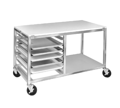 Bun Pan Rack, Work Table - Double Section, Angle Slides & Open Shelf, 48"W x 24"D x 31.5"H, Aluminum Construction w/ Poly Top, End Load, 5" Angle Spacing, (4) 18" x 26" or (8) 13" x 18" pans (2 per shelf), 5" Swivel Stem Casters model # CSS45O, Made in USA, NSF, 59lbs. (ITEM WEIGHT ONLY), weight does not include 50 lbs. for pallet weight