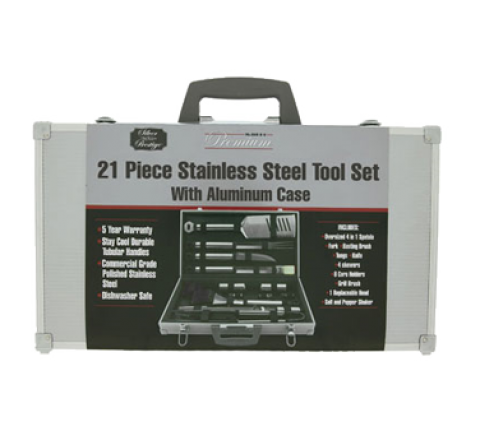 Mr. Bar-B-Q® Silver Prestige Barbeque Tool Set, (21) piece, includes: 4-in-1 spatula, fork, tongs, basting brush, knife, (4) skewers, (8) corn holders, grill brush, (1) replacement head, salt & pepper shaker, stainless steel, aluminum case, 5 year warranty (Patented) (must be purchased in case quantities)