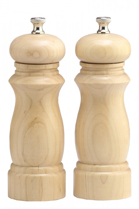 (062025) Chef Professional Series Salem Salt/Pepper Mill Set, 6" high, natural finish, stainless steel pepper grinder, ceramic salt grinding mechanism, Made in USA, lifetime warranty