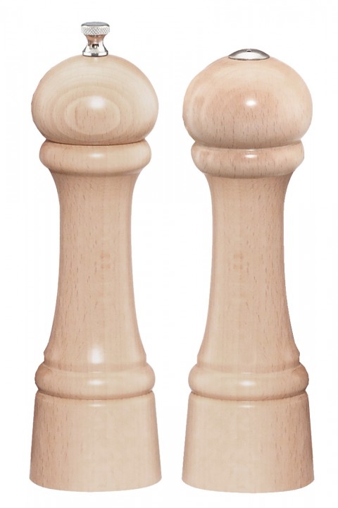 (082009) Chef Professional Series Windsor Salt Shaker/Pepper Mill Set, 8" high, natural finish, stainless steel grinding mechanism, Made in USA, lifetime warranty