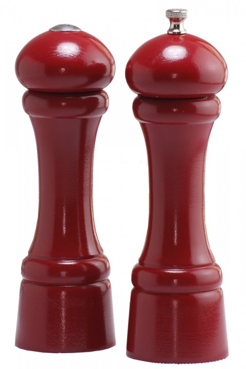 (086007) Autumn Hues Professional Pepper Mill & Salt Shaker Set, 8" high, wood, tempered stainless steel gear, Made in USA, lifetime warranty, candy apple red